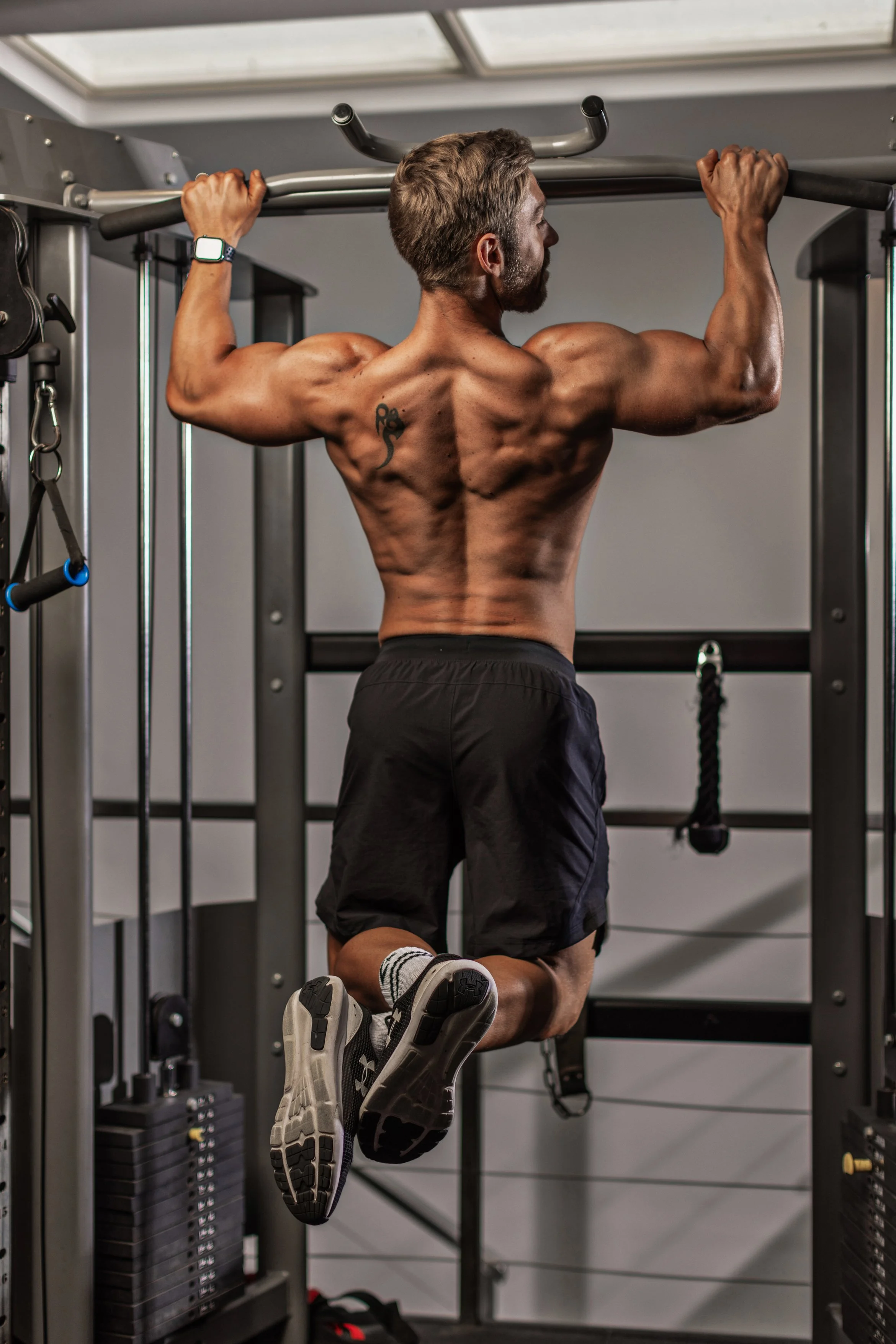 A muscular man doing pull-ups in a gym.